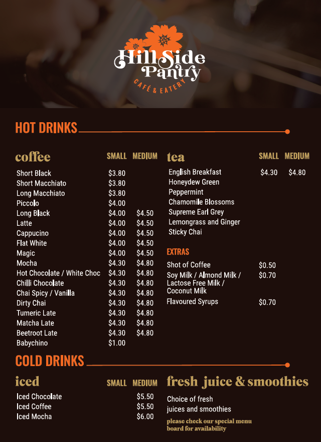 Welcome to Hillside Pantry, a delightful café nestled at the corner of Heatherton Road and Matthew Flinders Ave in Endeavour Hills, VIC. This hidden gem boasts a menu that artfully caters to both breakfast and lunch enthusiasts. With a range of offerings from scrumptious breakfast staples to innovative iced drinks, there's something for every palate.